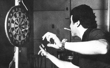 Two other corners of the square had simple chairs, dart board and 44 gallon